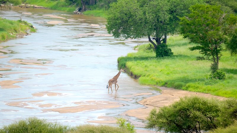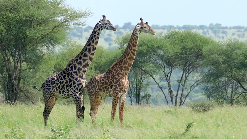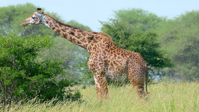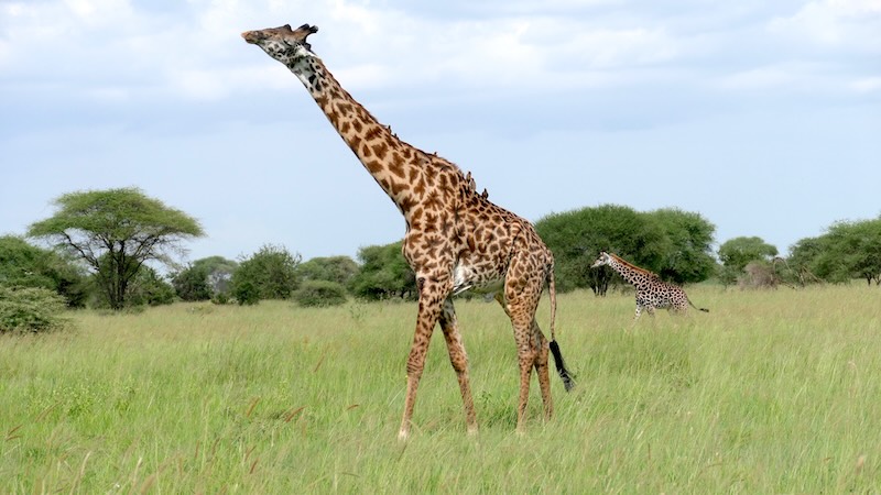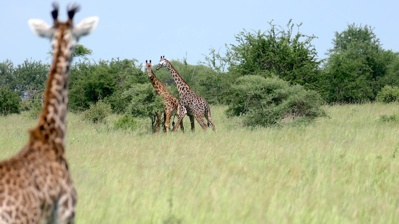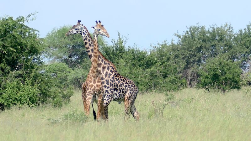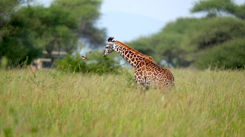 Nach der Mittagspause in der Tarangire Safari Lodge ging es wieder runter und dann rechts rum in Richtung Tarangire Fluss. Wie wir schon von oben einen einsamen Giraffen-Bullen den Tarangire Fluss durchqueren gesehen hatten, so war jetzt natürlich klar, da sind auch Giraffen-Herden. Kurz bevor wir nun zum Tarangire Fluss kamen wurden viele Giraffen auf der Gras-Savanne unsere Begleiter.