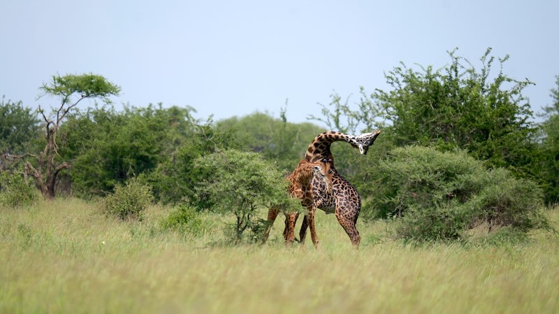 Zwei Giraffen-Bullen kämpfen