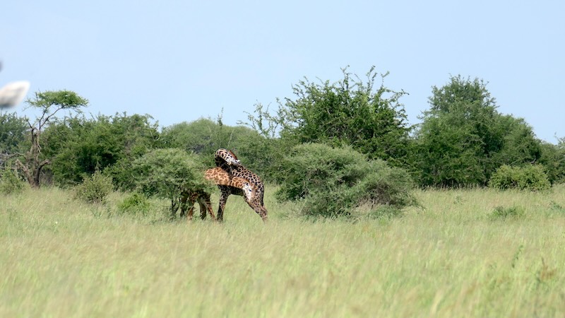 „Sie müssen mit ihren Körpern haushalten. Sie müssen auf ihren hohen Blutdruck achten“, Elly war nun in seinem Element und ließ uns wieder an seinen Erfahrungen teilhaben. Es sah alles sehr slow-motion aus. Wir hatten nun Zeit diese beiden Giraffen-Bullen zu beobachten, Fotos und Videos zu machen und natürlich den Ausführungen von Elly zu lauschen. „Schaut, der Hieb von dem rechten Bullen, der saß“. Mit dem langen Hals mit den scharfen Hörner ging der Hieb rum um den anderen Bullen an die rechte Schulter. „Wenn sie mal einen richtigen Hieb setzen können, dann kann es auch zu richtigen Rissen kommen und im schlimmsten Fall auch zu Knochenbrüchen“.
