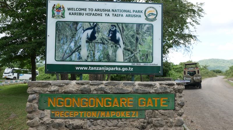 Nach knapp 10 Minuten kam Elly wieder und wir starteten in unser Abenteuer Safari. Vor uns der erste Nationalpark, der Arusha NP und unsere Freude stieg bis ins Unermessliche. Noch in diese Gedanken vertieft, drehte sich Elly kurz zu uns um während er durch den Torbogen fuhr.