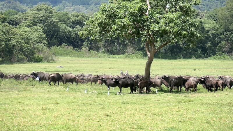 Und noch weiter hinten gab es eine weitere Gruppe, welche dort graste und unter den vielen Bäumen im Schatten lagen. Es war eine sehr große Gruppe von Büffeln. So viele Büffel, die Kaffernbüffel, so toll. Die Büffel wirkten aus der Ferne so unscheinbar, wirkten so friedlich. Aber wir werden noch viel über die Büffel erfahren. Elly meinte bei diesem Stopp nur kurz „Kaffernbüffel sind mit die gefährlichsten Tiere hier in Afrika. So wie auch die Hippos!“