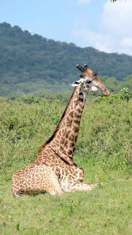 Nur einen Stopp später dann viele Giraffen in unmittelbarer Nähe auf der Lichtung. Sie lagen im Gras, genossen die Ruhe und waren am Wiederkäuen. Selbst liegend ragen sie mit ihren langen Hälsen weit über die vielen Sträucher in der kleinen Serengeti hinweg. Elly konnte das dann auch bestätigen. „Es sind Massai-Giraffen und eine der größten Giraffen-Arten hier in Afrika!“