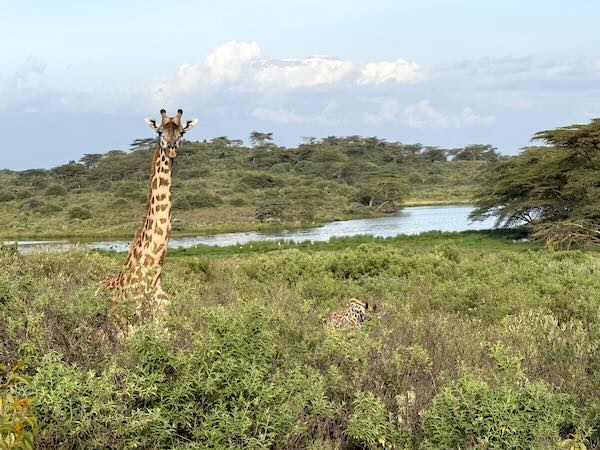 Grüne Savanne, blauer Himmel mit weißen Wolken, der Kilimandscharo und mittendrin ein Giraffenhals.