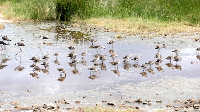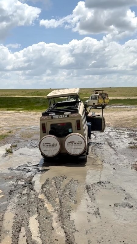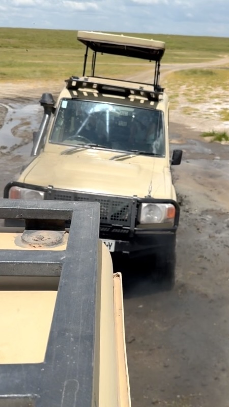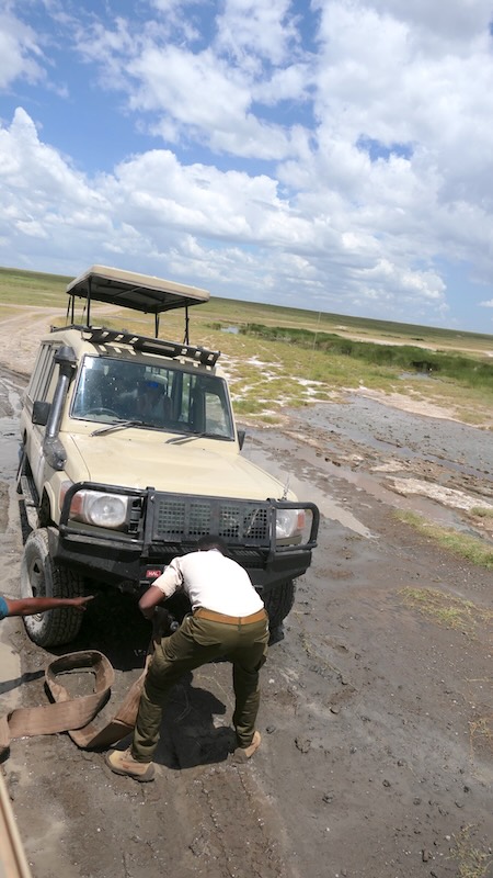 Als wir nun zurück wollten durch die Wasserrille mussten wir erst einmal warten. Von vorne kam ein anderes Fahrzeug. Er hatte nun weniger Glück mit der Furche, mit dem Schlamm. Voll mit den Vorderrädern rein, gerade noch mit der Schnauze raus. Mit den Hinterrädern rein in den Schlamm und dann ging nichts mehr. Elly meinte „Mehr Gas geben, in Bewegung bleiben“. Aber die Räder drehten durch und schon saß der LandCruiser fest. Er saß fest inmitten der vielen Löwen. Es ging nichts mehr. Vor, zurück und er hing nun fest. Elly gab ihm dann Zeichen. Elly wollte ihn von vorne anschieben und wieder rückwärts raus aus dem Schlamm drücken. Aber der Guide hatte es nicht kapiert und gab eher nach vorne Gas als zurück. „Mist nun steckt er so richtig fest“. Mein Blick ging auf die beiden jungen Frauen im Fahrzeug. Sie lachten. Na, dann ist ja alles gut. Ich nehme an sie dachten, das gehört alles zur Safari dazu. Das hatten hier alle dazu gebucht. Auch der Schriftzug auf dem LandCruiser war passend. In großer Schrift stand etwas wie „Unforgettable Safari Tours“ drauf, wie passend! Klar, das war eine Extra-Buchung!