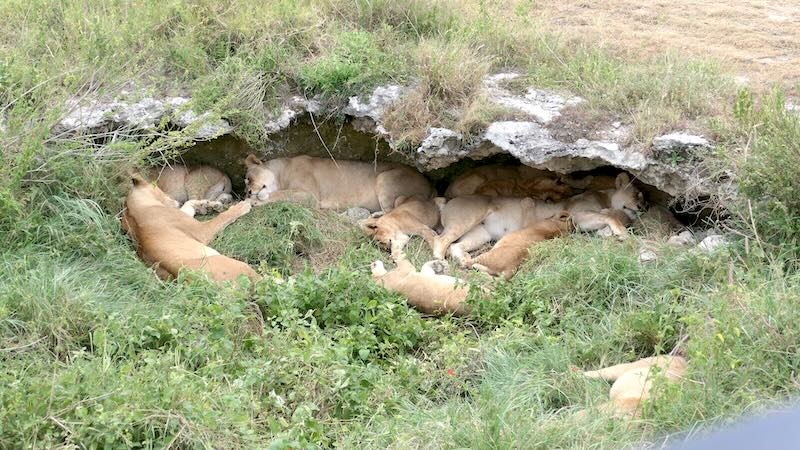 Nun ging es also los in die Serengeti. Weite, nichts als Weite und ab und zu ein paar Felsformationen. Gegen Mittag gab es dann die ersten Wasserstellen. Wasserstellen mit Löwen zum Mittag. Vorher und nachher nichts als Weite und nun ein Löwenrudel. Oberhalb der Wasserstelle lagen die Jungtiere mit ihren Müttern unter einer Felsplatte. Ganz unscheinbar. Sie dösten in der Mittagssonne. Unterhalb der Felsplatte war es voll. Sie lagen alle zusammengeknuddelt unter dieser Platte. Ab und zu stand eine Löwin auf, blickte in die Weite, ging ein paar Meter und legte sich dann wieder unter die Felsplatte. Kurz bevor die Löwin sich wieder hinlegte wurde gegrummelt, die kleinen Löwen-Jungen wurden zur Seite geknufft und Schwupps lag auch wieder die Löwin. Unten am Wasserloch lagen zwei erwachsene Löwen-Männchen. Auch sie dösten in der Mittagssonne. Wir hatten uns erst die jungen Tiere angesehen, wie auch ein paar andere LandCruiser. Unten bei den Löwen stand auch schon ein Fahrzeug und da wollten wir uns dann auch noch dazu gesellen.