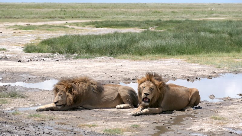 Die Fahrspur ging durch eine Senke gefüllt mit Wasser. Mit Ach und Krach ging es durch, in voller Schieflage. „Jetzt bloß nicht stehen und stecken bleiben“, dachte ich bei mir. Es ging alles gut. Elly fuhr in voller Schieflage hindurch und ehe wir uns versahen standen wir mit dem LandCruiser in unmittelbarer Nähe bei den Löwen-Männchen. Die Löwen dösten und wir machten unsere Fotos. Es waren zwei ältere Löwen-Männchen. Beide Löwen hatten bereits ihre volle Löwen-Mähne und eben die schwarze Schnauze. Die Schnauze, welche sich aufgrund einer Pigmentierung über die Jahre schwarz verfärbt. Die Löwen-Männchen lagen Rücken an Rücken in der Ebene. Auf wenn sie dösten hatten sie so liegend doch die gesamte Ebene im Blick. Hatten uns im Blick, hatten die obere Felsplatte mit den anderen Löwen im Blick. Die Augen geschlossen, die Ohren nach hinten geklappt, so sahen sie dösend aus. Über das Maul wurde gehechelt, gesabbert und geträumt von der nächsten Mahlzeit!