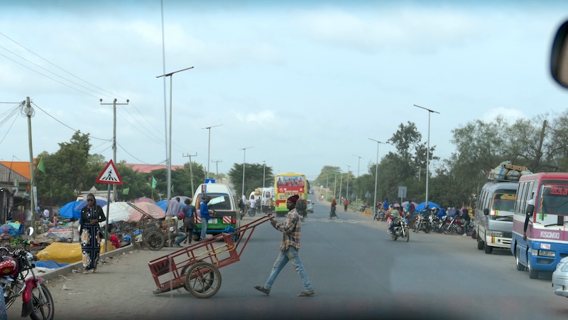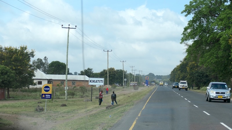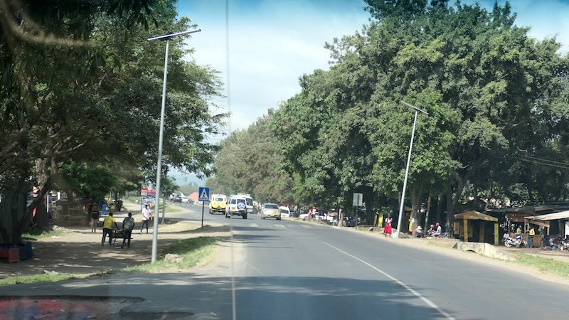 Neben der Straße bewegen sich auch viele Menschen zu Fuß vorwärts. Ein buntes Bild gerade am Nachmittag wenn die vielen Kinder aus der Schule kommen. Kinder in ihren Schuluniformen, Männer und Frauen in ihrer Massai-Tracht und alle tragen zu dem kunterbunten Straßenbild bei.
