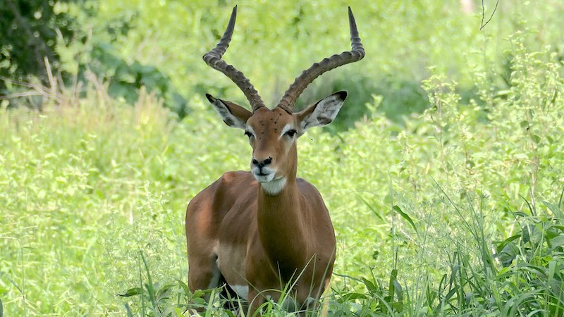 „Schaut mal, die Flusspferde. Sie sehen im Wasser, in dem Getümmel, so harmlos aus. Aber die sind extrem gefährlich. Sie haben durch ihre wuchtigen Hauer, durch ihre große Beißkraft keine natürlichen Feinde hier in Afrika. Jedes Jahr sterben auch mehr als 500 Menschen durch Flusspferde“.