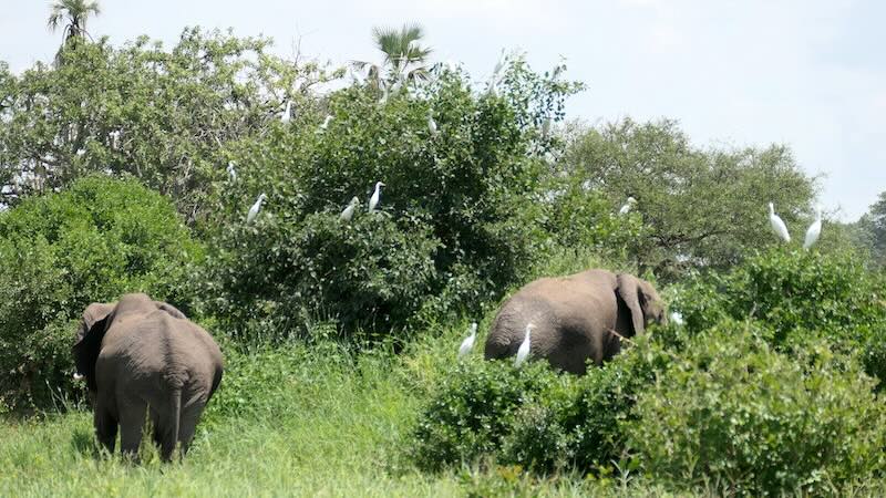 Eben noch die Giraffen bei den hohen Bäumen und im gleichen Moment Elefanten. Nicht einer, nicht zwei, sondern viele. Eben hatten wir noch unsere Fotos von den Giraffen-Bullen gemacht, da war für Elly schon klar, da vorne gibt es weitere Tiere. Elly sah schon in der Ferne viele Kuhreiher oben in den hohen Sträuchern.