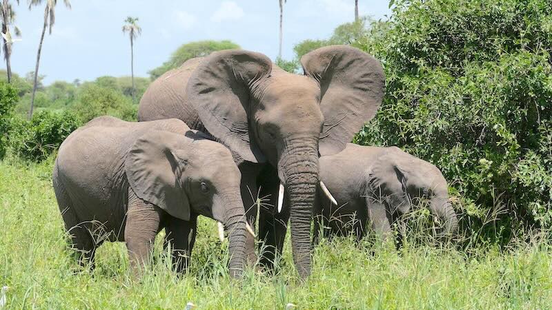 „Schau mal, zoom mal!“ meinte Elly. Und ja, da war ein Elefanten-Baby im hohen Gras erkennbar. Dazu die ersten, großen Elefanten-Kühe. „Wartet ab, die Herde ist bestimmt groß, da sind noch viel mehr Elefanten!“ meinte Elly. Und dann tauchten viele Elefanten auf. Sie kamen fressend hinter den Bäumen und Sträuchern hervor. Es war eine Herde mit vielen jungen Tieren. Die Stoßzähne waren noch sehr kurz. Und zwischen all diesen Elefanten saßen und flogen die Kuhreiher. Und auch die Giraffen schlenderten fressend vorbei.