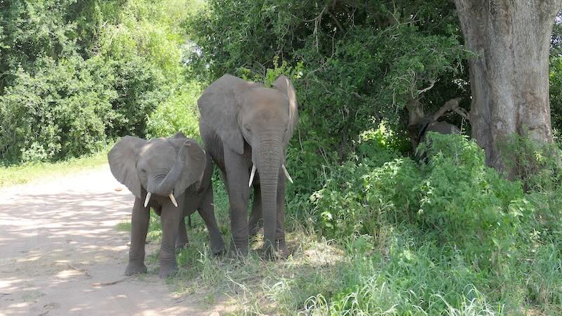 Dann, auf einmal, blieben zwei junge Elefanten vor unserem Land-Cruiser stehen. Sie plusterten sich auf und zeigten über ihre Ohren Größe. Sie drohten und kamen ein paar Fußtritte auf uns zu. Es sah sehr possierlich aus.