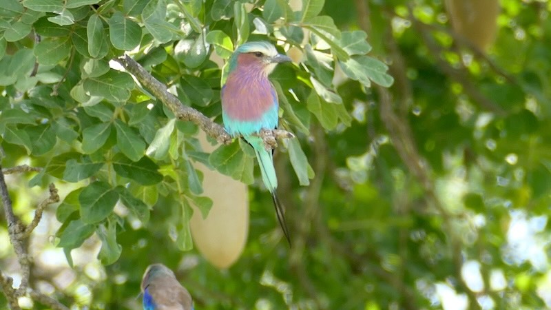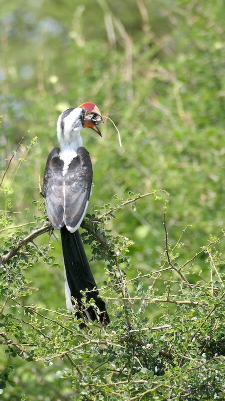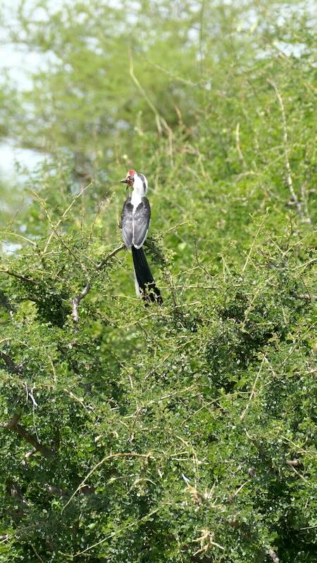 „Schaut mal, dort auf dem Strauch!“, schoss es bei Elly heraus. Wenn wir nicht sowieso angehalten hätten wegen der Impalas, dann hätten wir diesen bemerkenswerten Vogel wohl übersehen.