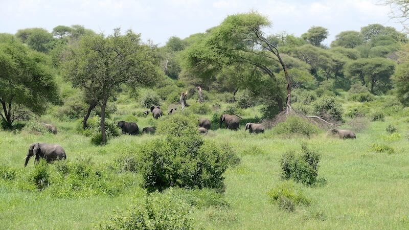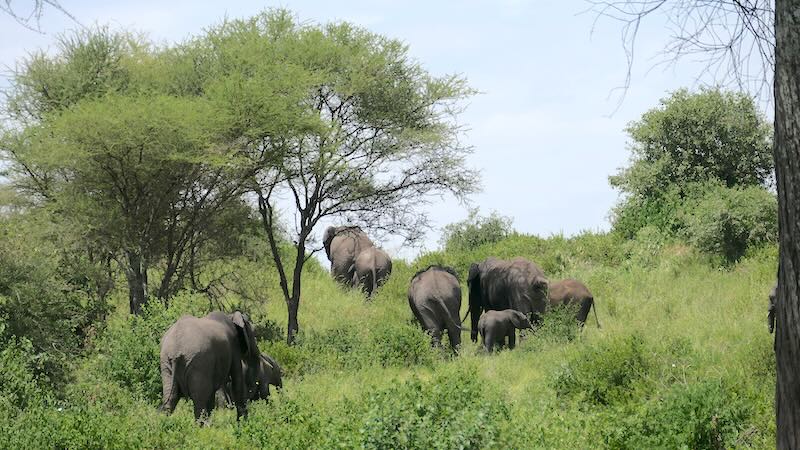 Eine halbe Stunde später ist das Spektakel vorbei. Die ganze große Elefanten-Herde wanderte weiter und nun auch die Halbstarken. Sie verschwanden durch die Sträucher und Bäume und bald konnten wir nur noch graue Rücken erkennen.