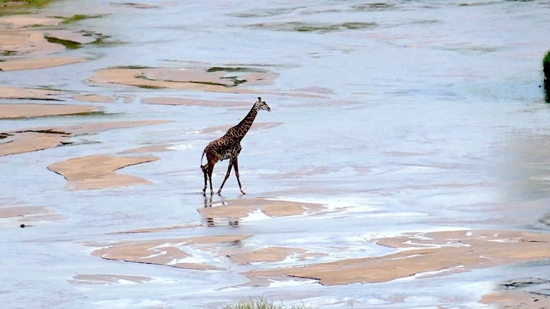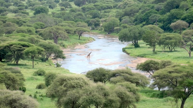 Unten in der Savanne fließt der Tarangire Fluss und der Fluss führte gerade nicht so viel Wasser. So trottete ein großer Giraffen-Bulle ganz langsam durch den Fluss. Von hier oben sah der Giraffen-Bulle so klein, aber trotzdem sehr imposant aus. Wir saßen nun hier oben auf der kleinen Steinmauer, tranken einen Kaffee, genossen den Blick runter in die Savanne und die vielen tierischen Besucher hier in der Lodge.