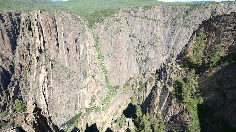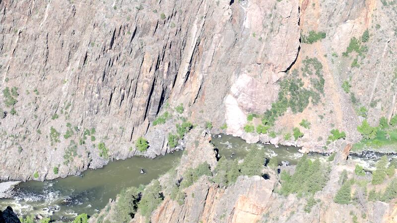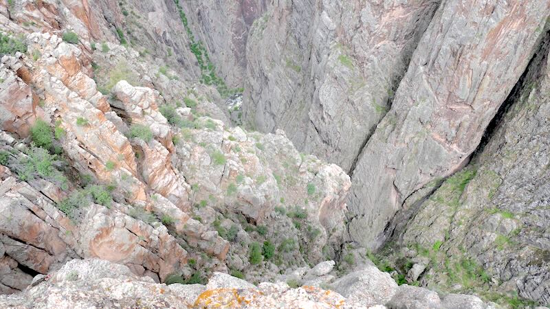 Der Name „Chasm View“ (Abgrund-Blick) ist hier Programm. Du stehst auf einer Klippe und blickst direkt in das „Schwarze Loch“ des Canyons. Dies ist eine der engsten Stellen des Canyons auf Höhe des Randes. Er ist hier nur etwa 335 Meter (ca. 1.100 Fuß) breit, während die Canyonwände fast vertikal 547 Meter (ca. 1.800 Fuß) in die Tiefe stürzen. Der Gunnison River hat hier ein extremes Gefälle und rauscht mit einer der höchsten Fallraten Nordamerikas durch die Schlucht.