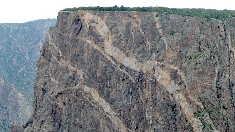 Die „Painted Wall“ (bemalte Wand) im Black Canyon of the Gunnison National Park ist die höchste vertikale Felswand in Colorado, mit einer Höhe von etwa 738 Metern (2.422 Fuß). Diese schiere Höhe macht sie zu einem dramatischen Anblick. Der Name stammt von den auffälligen, hellen Bändern aus Pegmatit, die sich über die dunklen Canyonwände ziehen. Diese Bänder sind das Ergebnis von uraltem geschmolzenem Gestein, das in Spalten eindrang und erstarrte, wodurch der „bemalte“ Effekt entstand.