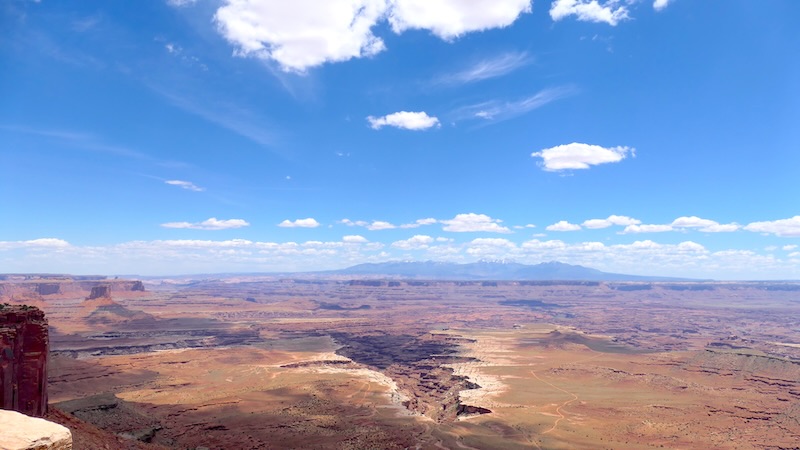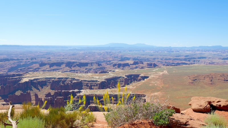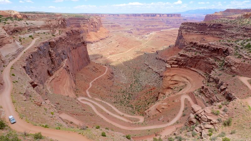 Von hier aus erblickst du die White Rim Road (die Offroad-Straße unten in der Ebene), den Green River Canyon und im Süden die bizarren Felsnadeln des The Needles-Distrikts (den wir später besprechen).