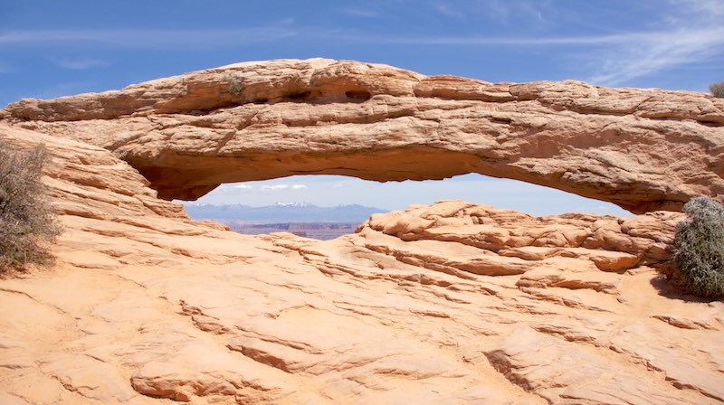 Kein Besuch im Canyonlands National Park ist komplett ohne den Mesa Arch. Dieser relativ kleine Felsbogen hat durch seine Lage Berühmtheit erlangt, denn er rahmt einen atemberaubenden Blick auf die Canyons und die La Sal Mountains in der Ferne ein.