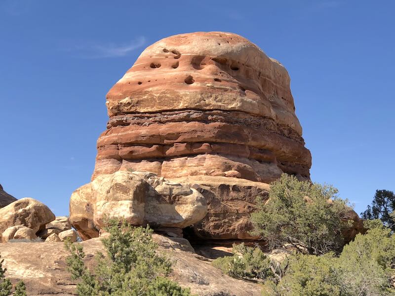 Für den ca. 17,2 km langen Rundweg solltest Du 5–7 Stunden einplanen. Der Startpunkt ist der Elephant Hill Trailhead. Beachte, dass die Zufahrtsstraße zum Elephant Hill unbefestigt ist.