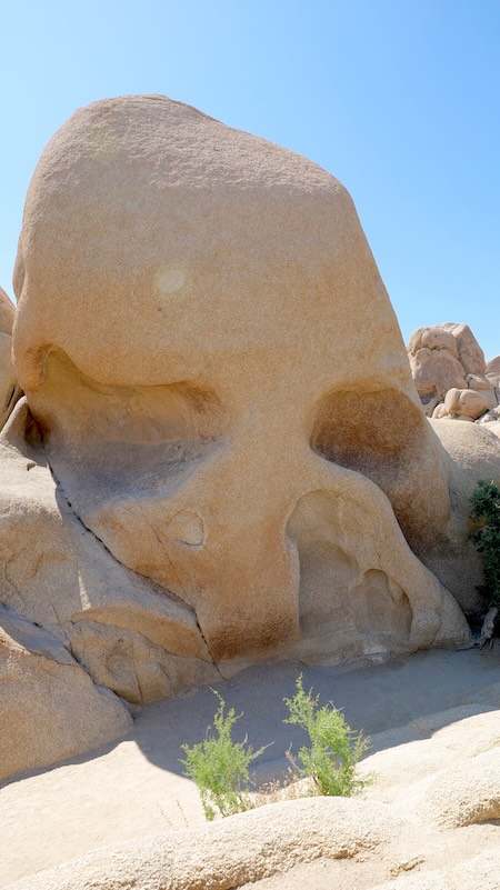 Skull Rock: Eine dramatische Felsformation, die durch Erosion über Jahrtausende hinweg geformt wurde und aussieht wie ein menschlicher Schädel. Er liegt direkt an der Hauptstraße in der Nähe des Jumbo Rocks Campground.