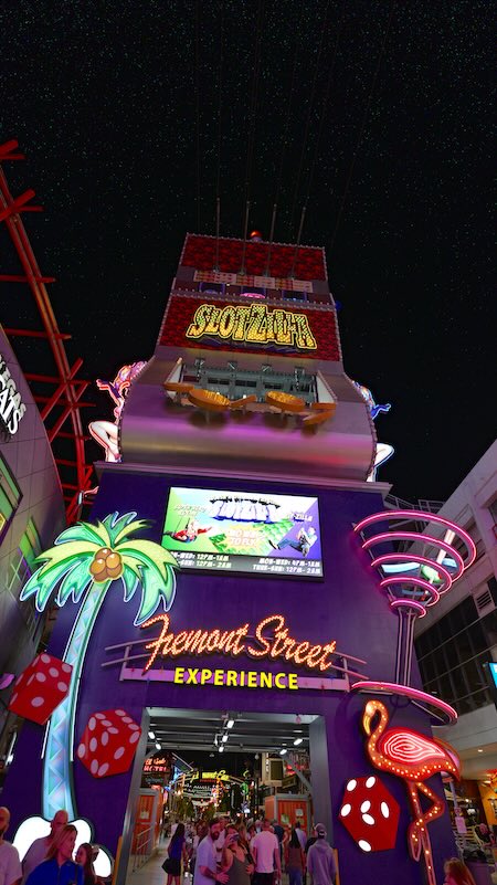 SlotZilla Zip Line: Wenn du Adrenalin liebst, kannst du wie ein Superheld in 25 oder 35 Metern Höhe über die Köpfe der Menschenmassen hinwegfliegen. Es gibt zwei Level: „Zipline“ (sitzend) und „Zoomline“ (liegend, über die gesamte Länge der Fremont Street).