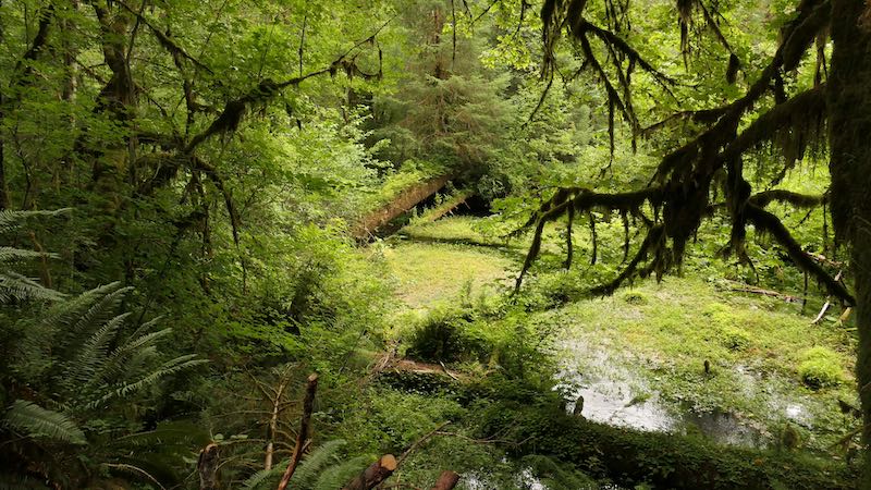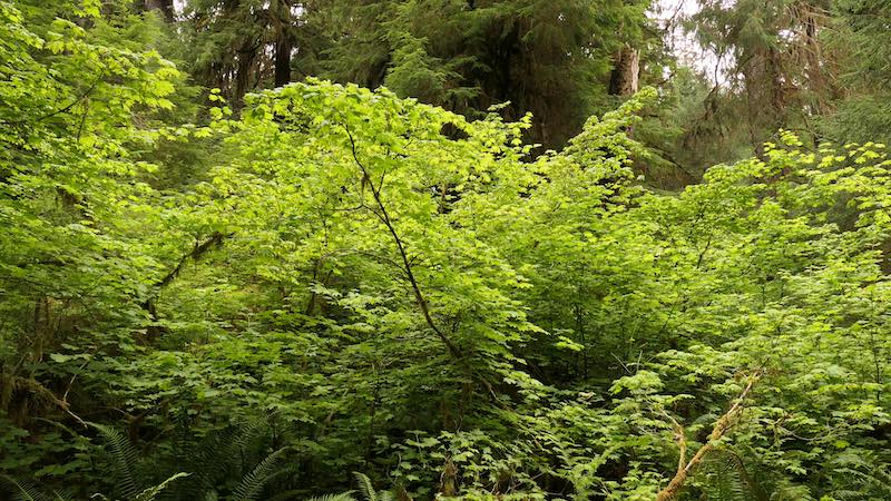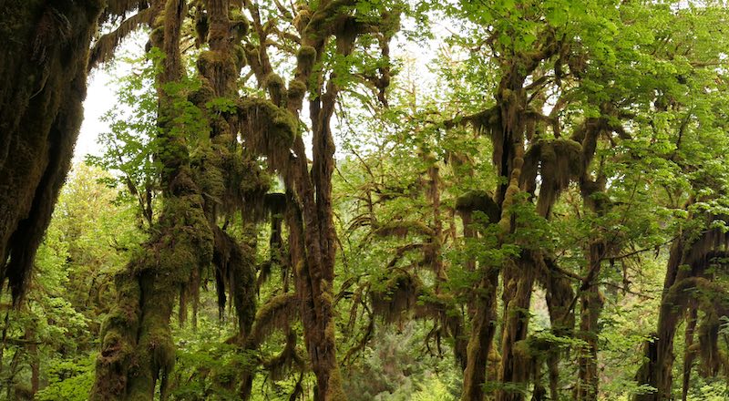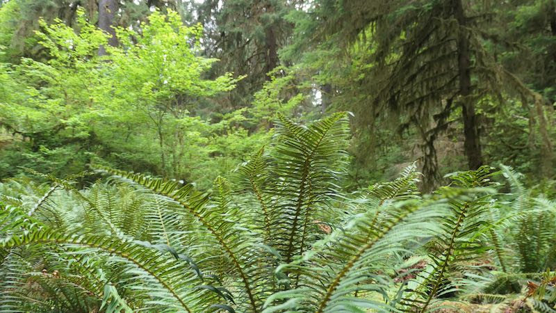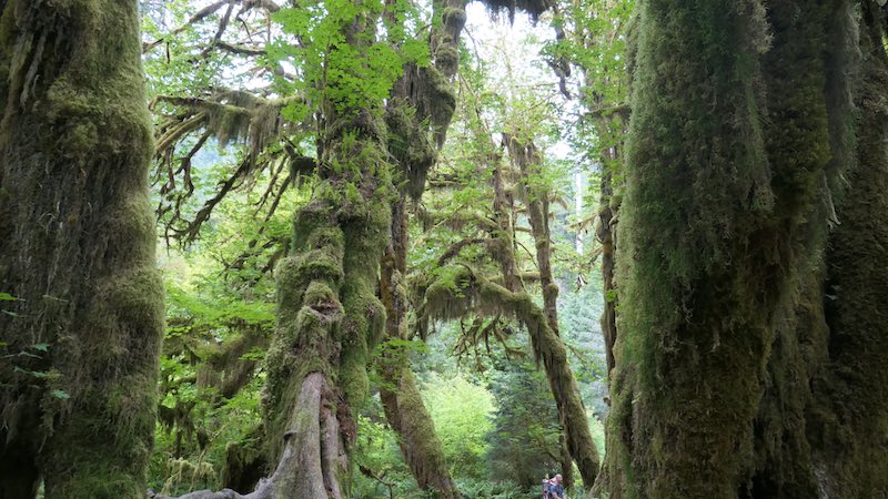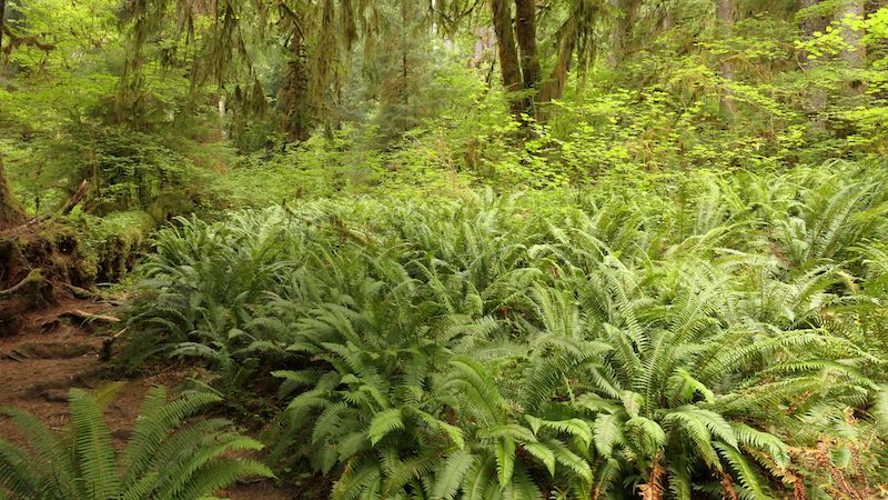 Im Westen des Parks, wo der jährliche Niederschlag Rekordwerte erreicht, liegen die mystischen Regenwälder wie der Hoh Rainforest oder das Quinault Valley. Riesige Sitka-Fichten und Westliche Hemlocktannen sind hier über und über mit Farnen und dicken Moosteppichen bedeckt.