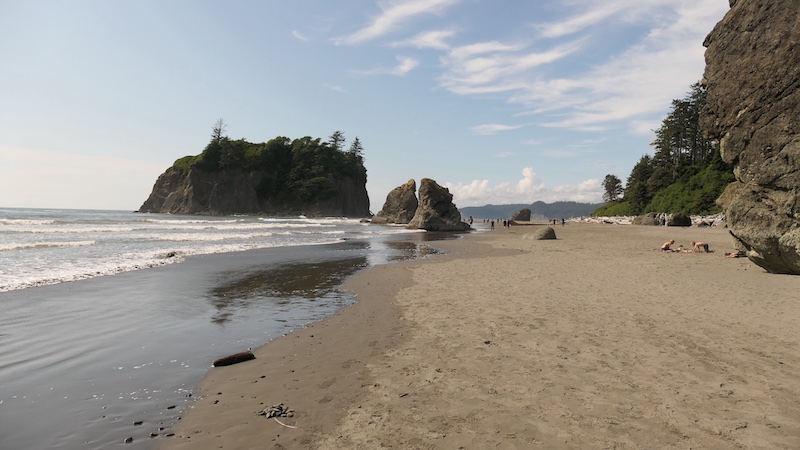 Ruby Beach: Dieser Strand ist berühmt für seine dramatischen Sea Stacks (aus dem Meer ragende Felsnadeln) und den rötlich schimmernden Sand. Auch hier liegen riesige Stämme verstreut, die oft als natürliche Bänke dienen, um den Sonnenuntergang zu beobachten.