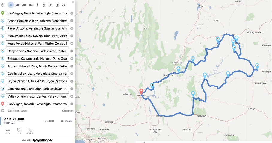Ein Blick auf die Karte macht schnell deutlich, das für den Grand Circle Las Vegas der ideale Ausgangs- und Zielpunkt ist, wenn man Flüge von und nach Deutschland im Hinterkopf hat.