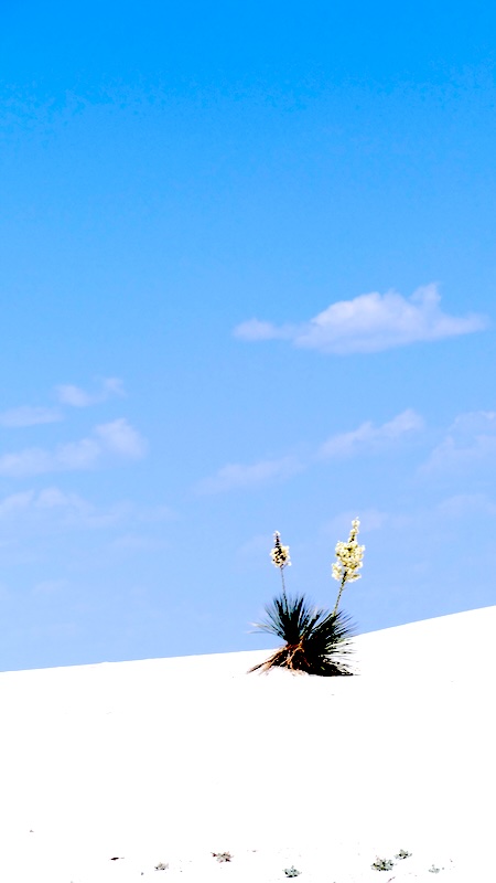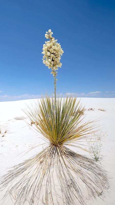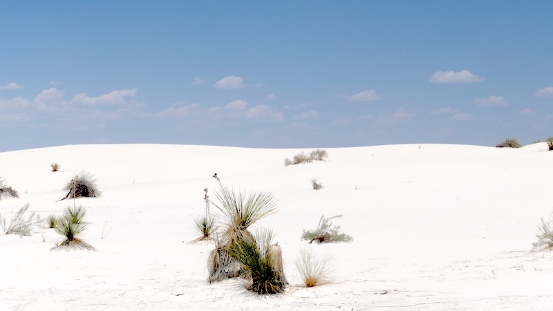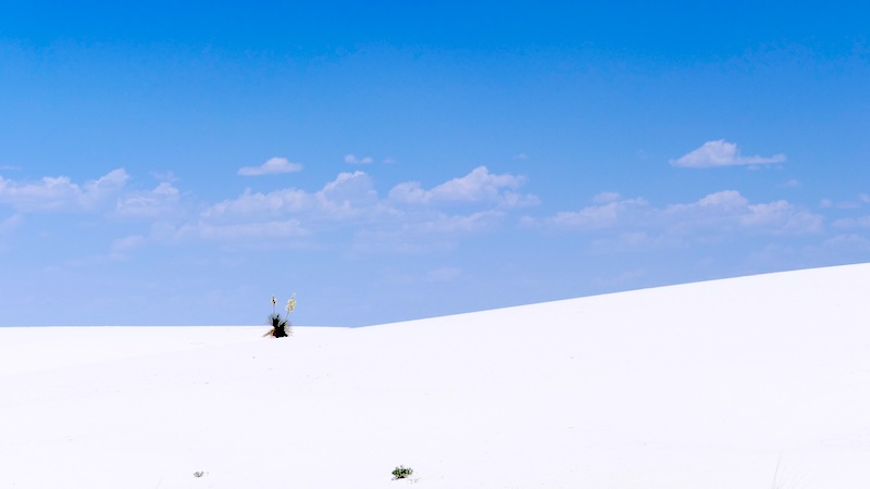Farbakzente: Suche nach den grünen Yucca-Pflanzen, die aus dem Weiß ragen. Das Grün gegen den weißen Sand und den tiefblauen Himmel von New Mexico ist ein klassisches Motiv.