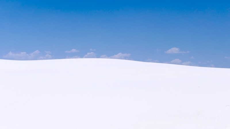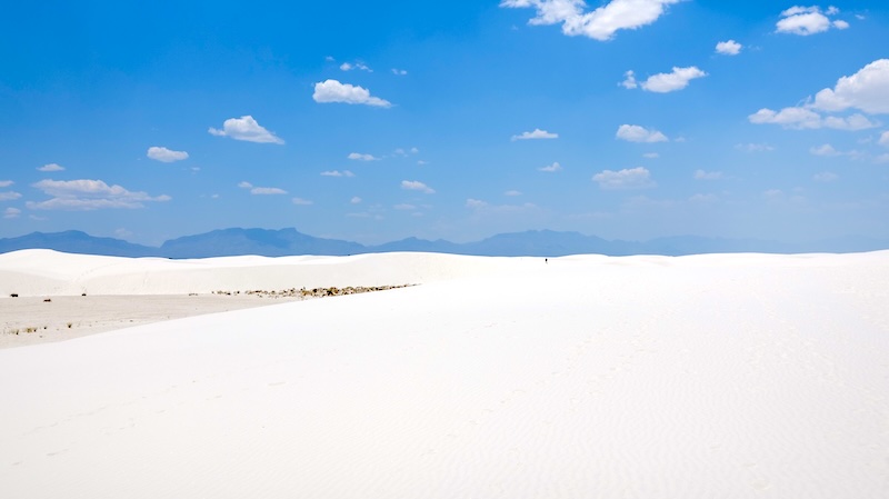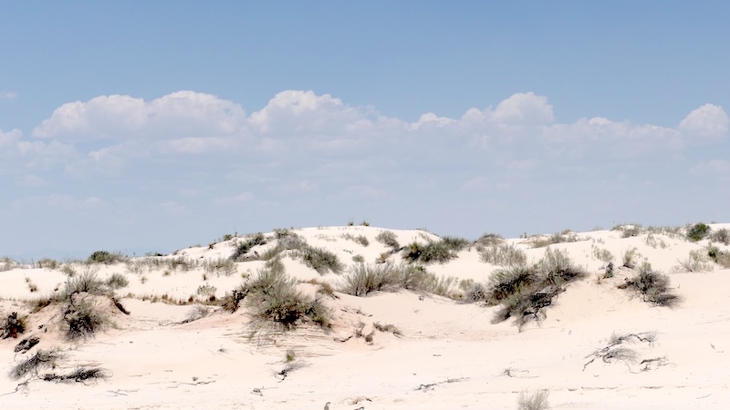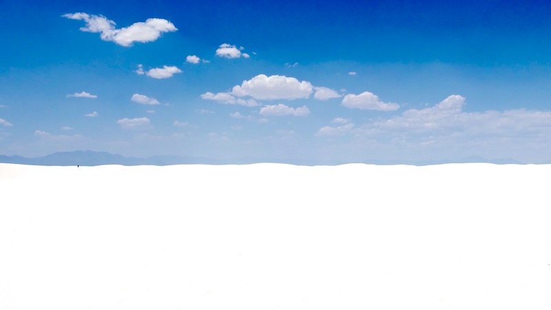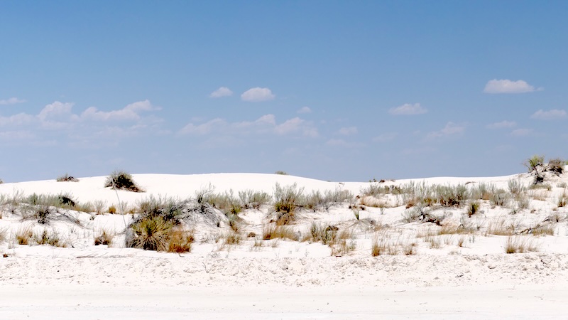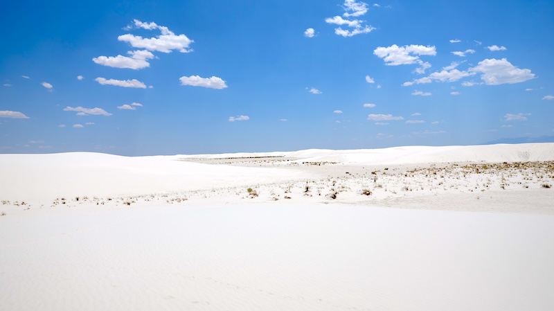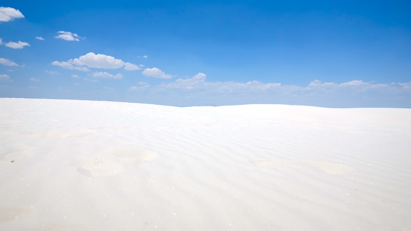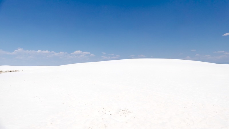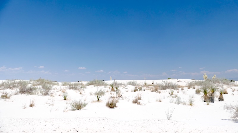 Das größte Problem in White Sands: Deine Kamera denkt, es sei extrem hell und regelt das Bild herunter. Das Ergebnis? Der weiße Sand sieht auf den Fotos schmutzig-grau aus.