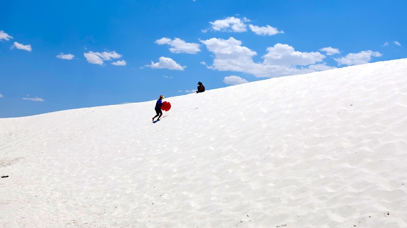 Wer sagt eigentlich, dass man Schlitten nur im Winter braucht? In White Sands ist das Rodeln auf den Dünen eine der beliebtesten Aktivitäten für Kinder und Erwachsene. Da der Gips-Sand sich eher wie feines Pulver als wie klebriger Strand-Sand verhält, gleitet man erstaunlich gut.