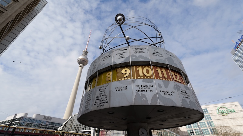 16:00 Uhr – Alexanderplatz: Ein kurzes Stück weiter stehst du unter dem Fernsehturm. Schau dir die Weltzeituhr an und genieße das trubelige Berliner Leben.