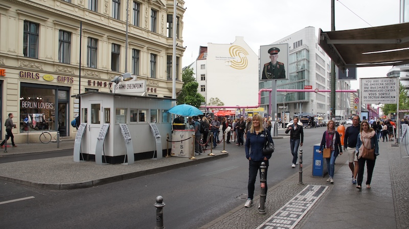 Lauf weiter zum Checkpoint Charlie (zwar touristisch, aber ein Muss für die Kaltkrieg-Geschichte).