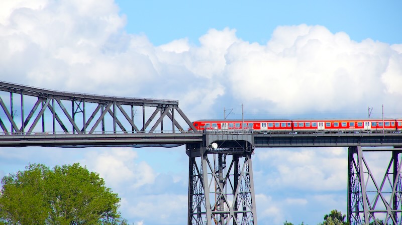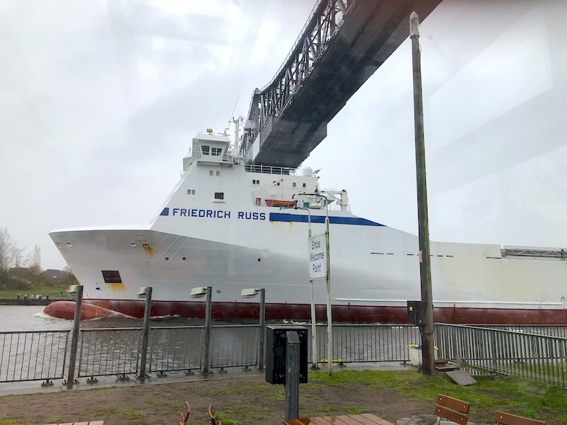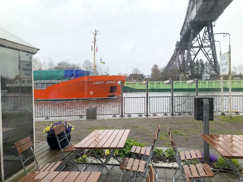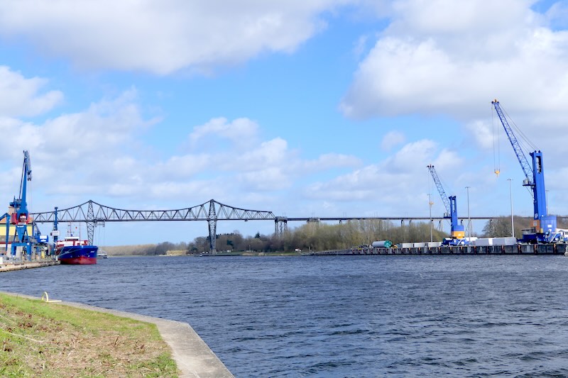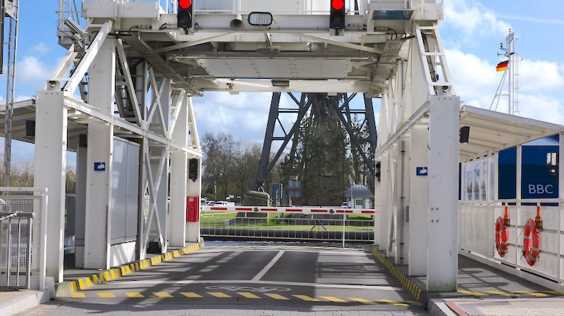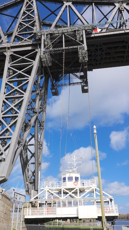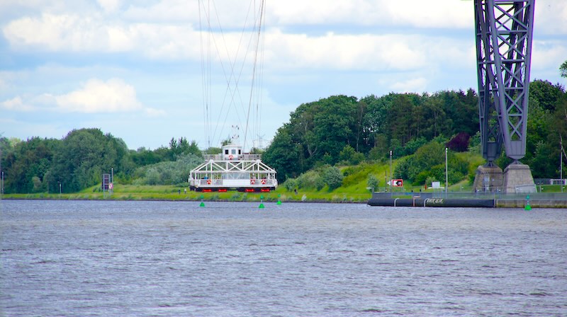 Das Besondere: Unter der Eisenbahnbrücke hängt eine Schwebefähre, die Autos und Fußgänger über den Kanal setzt. Nach der Havarie vor einigen Jahren ist sie seit 2022 wieder in Betrieb.