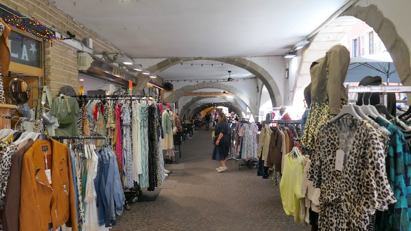 Ein besonderes Merkmal sind die Bogengänge (Arcades), die die Straßen säumen. Sie wurden früher gebaut, damit die Händler ihre Waren auch bei Regen im Trockenen verkaufen konnten.