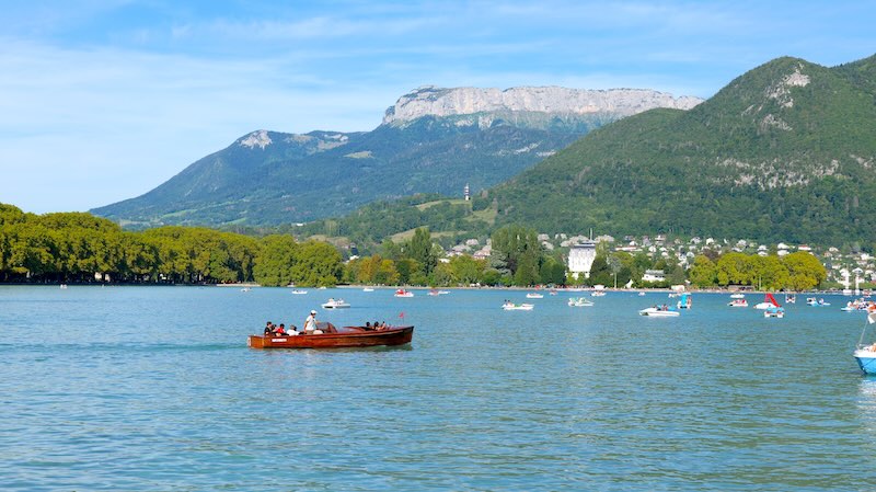 Elektroboot mieten: Wenn du es gemütlicher magst, leih dir ein führerscheinfreies Elektroboot (z.B. ein „GoBoat“ mit integriertem Picknicktisch). So entdeckst du versteckte Buchten und das berühmte Château de Duingt vom Wasser aus.