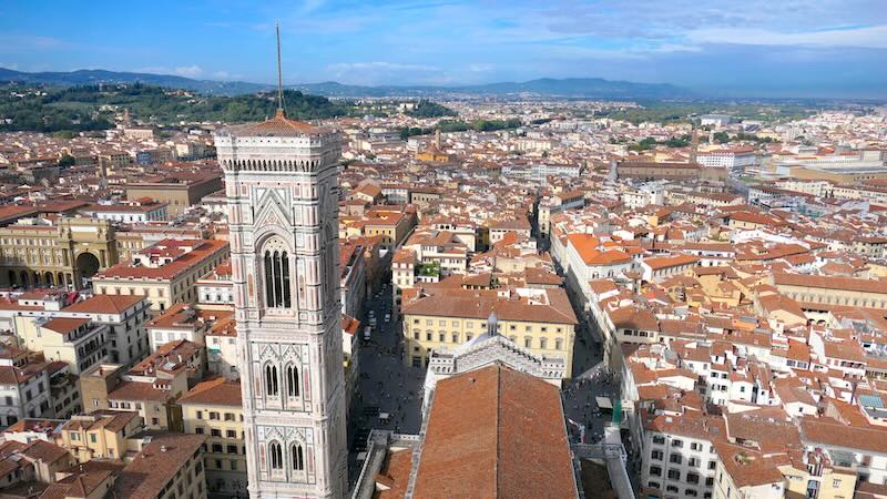 Neben der Kathedrale steht der Glockenturm, entworfen von Giotto di Bondone. Dieser freistehende Turm ist ebenfalls reich verziert und harmoniert mit der Kathedrale in seiner Marmorverkleidung. Er ist etwa 84 Meter hoch und bietet ebenfalls eine beeindruckende Aussicht über Florenz.