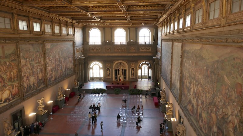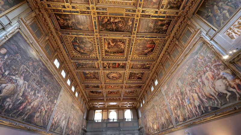 Der Palazzo Vecchio beherbergt prächtige Räume, die einst für Regierungsgeschäfte, Empfänge und Versammlungen genutzt wurden. Besonders beeindruckend ist der Salone dei Cinquecento (Saal der Fünfhundert), der größte Raum des Palastes. Dieser Saal wurde 1494 im Auftrag von Savonarola geschaffen, um die Sitzungen des Großen Rates der Republik Florenz abzuhalten. Der Raum ist mit monumentalen Gemälden von Giorgio Vasari geschmückt, die Schlachten und Siege der Florentiner darstellen.