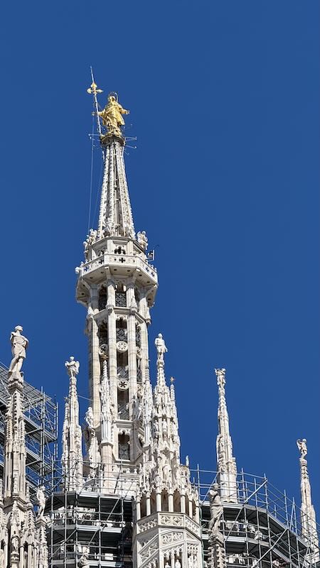 Auf der höchsten Spitze des Doms, in 108,5 Metern Höhe, thront die vergoldete Statue der Jungfrau Maria, liebevoll „Madonnina“ genannt. Sie ist die Schutzpatronin Mailands und war lange Zeit der höchste Punkt der Stadt.