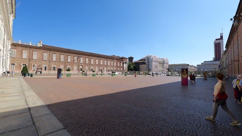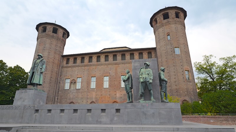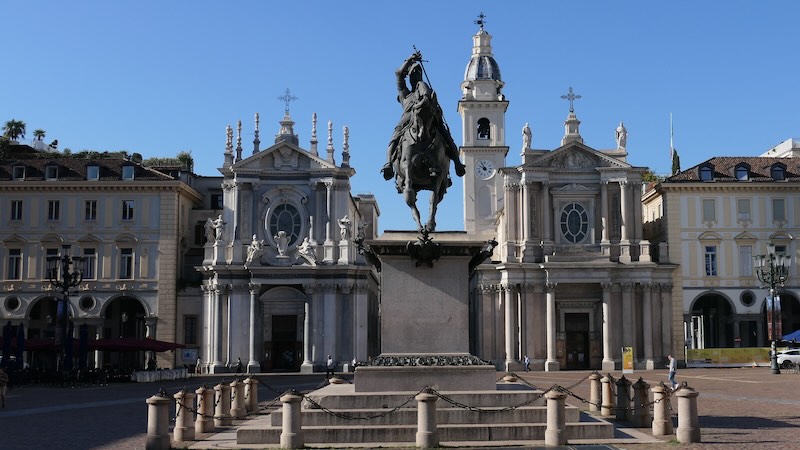 Emanuele Filiberto zu Pferd: In der Mitte des Platzes thront das monumentale Reiterstandbild „Caval ’d Brons“. Es zeigt den Herzog, der sein Schwert in die Scheide steckt – ein Symbol für den Frieden nach der Schlacht von St. Quentin.