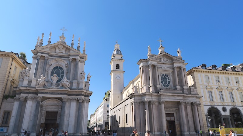 Wenn du am südlichen Ende des Platzes stehst, blickst du auf zwei fast identische Barockkirchen, die direkt nebeneinander stehen und das Tor zur Via Roma bilden. Es handelt sich dabei um die Santa Cristina (rechts) und die San Carlo Borromeo (links).