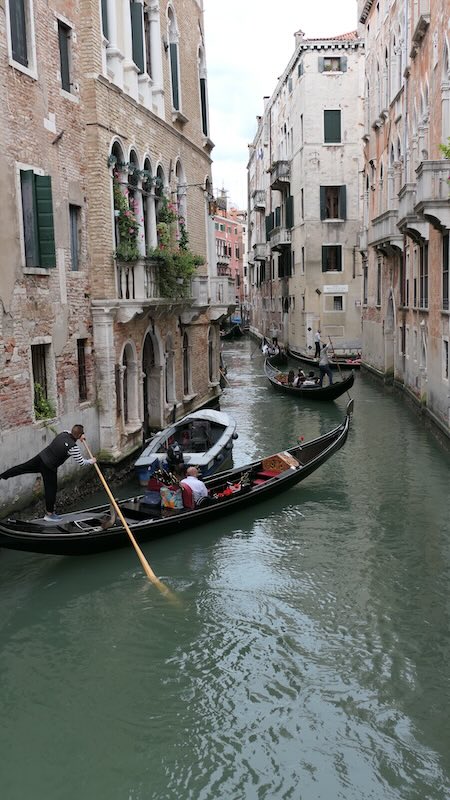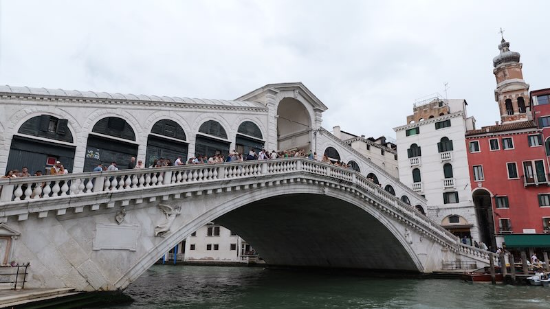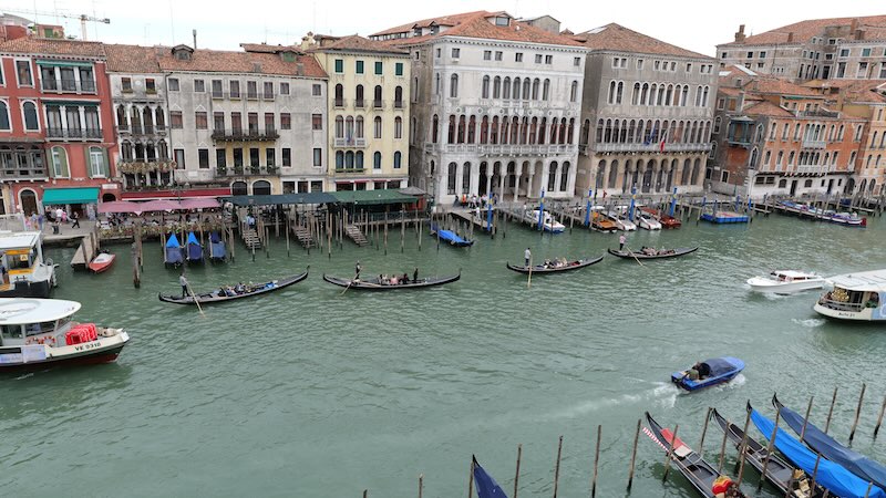 Von der Brücke aus hat man einen atemberaubenden Blick auf den Canal Grande, die umliegenden Paläste und die Gondeln, die darunter hindurchfahren.