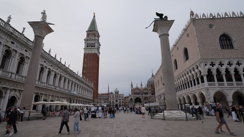 Der Platz ist von beeindruckenden Bauwerken umgeben, darunter der Markusdom (Basilica di San Marco), der Dogenpalast (Palazzo Ducale) und der Markusturm (Campanile di San Marco).
