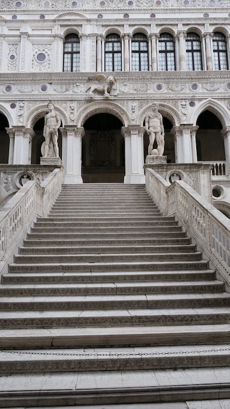 Die berühmte Seufzerbrücke verbindet den Dogenpalast mit den Gefängnissen und war der letzte Blick auf Venedig für viele Gefangene.Die Goldene Treppe Scala d’Oro ist eine der prächtigsten Treppen Europas und führte in die privaten Gemächer des Dogen.