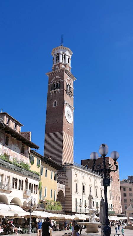 Mit 84 Metern ist der Torre dei Lamberti der höchste Turm Veronas. Der mittelalterliche Turm bietet eine spektakuläre Aussicht über die Dächer der Stadt und auf die Piazza.