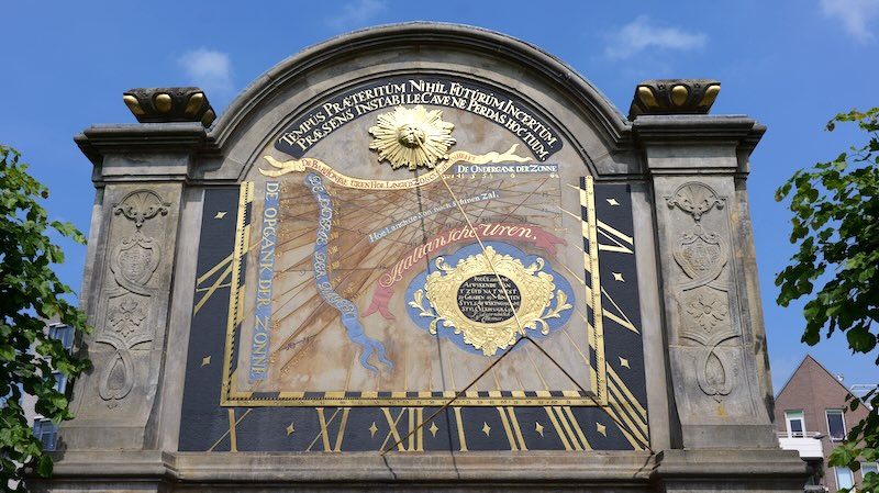 Der Haupteingang zum Garten befindet sich am Turfsingel und wird durch das beeindruckende Sonnenuhr-Tor von 1731 markiert. Die spezielle Sonnenuhr zeigt nicht nur die Zeit auf verschiedene Arten an, sondern trägt auch eine lateinische Inschrift: „Tempus Præteritum Nihil Futurum Incertum. Præsens Instabile Cave Ne Perdas Hoc Tuum“ – übersetzt: „Vergangene Zeit ist nichts, zukünftige ist unsicher, gegenwärtige ist zerbrechlich. Sorge dafür, dass du deine nicht verschwendest.“