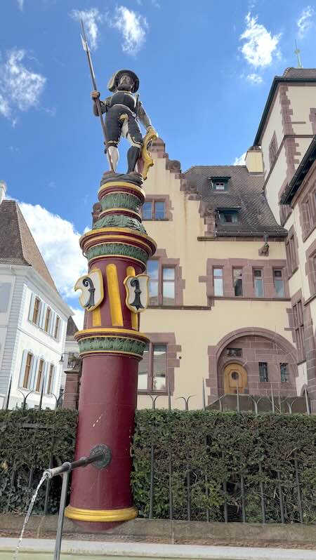 Das Brunnenbecken ist flach und mit schwarzem Asphalt ausgegossen, sodass nur eine geringe Wasserschicht (etwa 19 Zentimeter) vorhanden ist. In diesem Becken sind zehn maschinell betriebene Skulpturen integriert. Durch ihre synchronisierte Bewegung und das daraus resultierende Wasserspiel entsteht ein lebendiger, fast tänzerischer Effekt, der den Brunnen zu einem einzigartigen Wahrzeichen Basels macht.